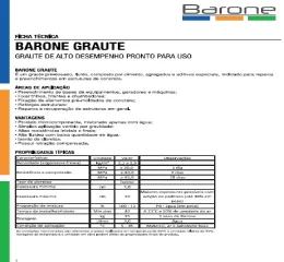 O Barone Graute é um graute pré-dosado, fluido, composto de cimento, agregados e aditivos especiais, indicado para reparos e preenchimento em estruturas de concreto. Pronto para uso, com alta fluidez, altas resistências inicial e final e retração compensada, esse produto consome 2.100 Kg/m³ ou 84 sacos/m³. Disponível em saco com 25 kg. A aplicação € simples vertido por gravidade.