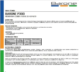 O Barone P300 é um produto monocomponente à base de água especialmente desenvolvido para a impermeabilização de estruturas de concreto, alvenaria, madeira e peças metálicas. Após a cura total, ele forma uma película impermeável. É fácil de aplicar e é durável. O consumo é de 3 kg/m² a 4 kg/m². Está disponível na cor preta e em balde com 18 Kg ou tambor com 200 l.