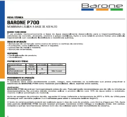 O Barone P700 é um produto monocomponente à base de água, especialmente desenvolvido para a impermeabilização de estruturas de concreto, alvenaria, madeira e peças metálicas. Após a cura total, ele forma uma película impermeável, com excelente flexibilidade e resistência química. É fácil de aplicar, e seu consumo é de 4 Kg/m². Está disponível na cor preta e em balde com 18 Kg ou tambor com 200 l.