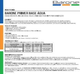 A Barone Primer Base Água é uma membrana monocomponete à base de água composta de asfalto modificado, especialmente desenvolvida para imprimação e preparo de superfícies para receber sistemas de impermeabilização com mantas asfálticas. Após a cura total, ela forma uma película impermeável. O produto seca rapidamente, apresenta ótima aderência, é atóxico, não inflamável e isento de odor. Disponível em balde com 18 Kg ou tambor com 200 Kg .