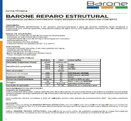 Barone Reparo Estrutural é um produto monocomponente à base de cimento Portland e fibras sintéticas, modificada com aditivos especiais. Após devida adição de água, forma uma argamassa tixotrópica com alta resistência e adesividade ideal para reparos em estruturas de concreto novas ou deterioradas, reposição de cobrimento de armaduras, reforços estruturais etc. Dispensa o uso de fôrmas, apresenta alta resistências inicial e final, possui retração compensada e é isento de cloretos e orgânicos voláteis (VOC).