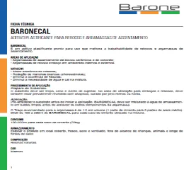 O Baronecal é um aditivo plastificante pronto para uso que melhora a trabalhabilidade de rebocos e argamassas de assentamento. Melhora a aderência de rebocos, reduz manchas brancas (eflorescências), além de diminuir a ocorrência de fissuras e a necessidade de água e cal na mistura. O consumo varia de 100 ml a 200 ml por saco de cimento. Disponível na cor marrom.