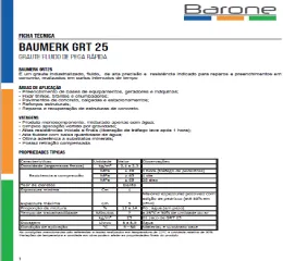 O Baumerk® GRT 25 É um graute industrializado, fluido, com alta precisão e resistências inicial e final. É indicado para reparos e preenchimentos em concreto, realizados em curtos intervalos de tempo. É fácil de aplicar, apresenta ótima aderência a substratos minerais e tem retração compensada. O consumo é de 2.100 Kg/m³. Deve ser armazenado na embalagem fechada e original, em local coberto, fresco, seco e arejado, com temperatura ambiente sempre que possível.