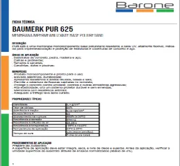 Baumerk® PUR 625 é uma membrana monocomponente à base de poliuretano resistente a raios UV. Altamente flexível, é indicada para impermeabilização e proteção de estruturas e coberturas de concreto e aço. Pronta para uso e adequada para tráfego leve após curado. O consumo é de 0,75 Kg/m² a 1,0 Kg/m² para cada camada. Está disponível em balde metálico com 25 Kg cada.
