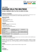 A Cola PVA Multiuso desenvolvida pela Barone é um adesivo à base de PVA (acetato de polivinila) e água ideal para uso em escolas, montagem e conserto de móveis, papel e papelão e substratos de madeira e laminados. É atóxica, vem pronta para uso e proporciona excelente aderência.