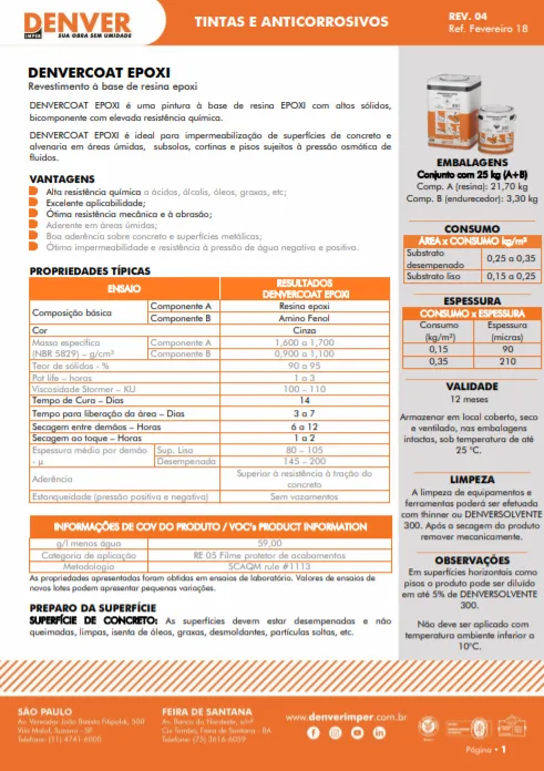 O Denvercoat Epóxi é uma pintura à base de resina epóxi com altos sólidos. É bicomponente e apresenta altas resistências química, mecânica e à abrasão. É ideal para impermeabilização de superfícies de concreto e alvenaria em áreas úmidas, subsolos, cortinas e pisos sujeitos à pressão osmótica de fluidos. É fácil de aplicar. Sua validade é de 12 meses.