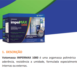 A Votomassa ImperMAX 1000 deve ser aplicada no contrapiso de áreas que recebem umidade com frequência, antes da camada de revestimento e rejuntamento. Ela garante 50% mais proteção contra água e é 30% mais aderente, de acordo com valores decorrentes de ensaios conforme as normas técnicas. Além de ter uma massa que espalha mais rápido e fácil na aplicação. O produto cumpre com as normas técnicas NBR 11905, NBR 12170, NBR 9575 e NBR 9474.