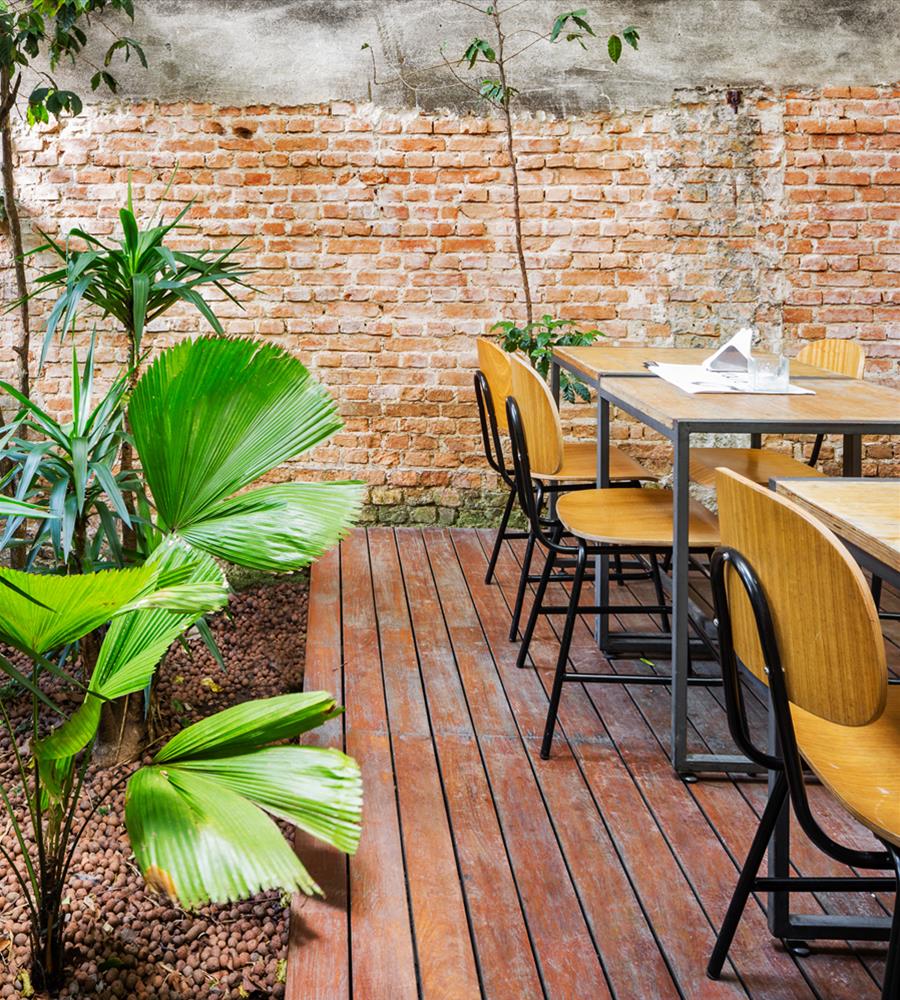 A área externa apresenta um deck com patamares distintos, que possibilita diversas apropriações de mobiliário e ocupação | Foto/imagem: Ana Mello